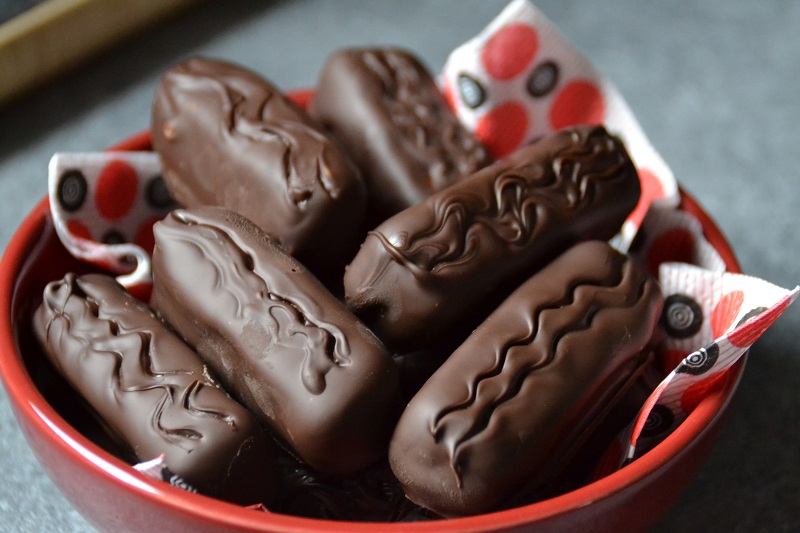 Pendant ce temps, faites fondre lentement le chocolat de couverture au bain-marie. Plongez chaque part dans le chocolat à l’aide d’un pique à fondue. Déposez délicatement sur du papier sulfurisé la part chocolatée (cette étape est un peu délicate).