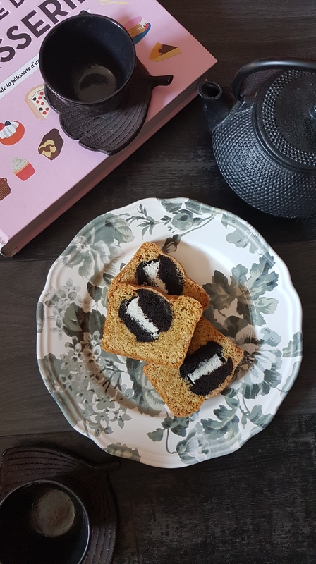 J’ai choisi pour inaugurer mon achat, une recette toute basique : le cake sucré. J’ai tout de suite succombé à la version « gâteaux cachés » et me lançais rapidement et facilement dans la réalisation d’un « Oréo Cake ».