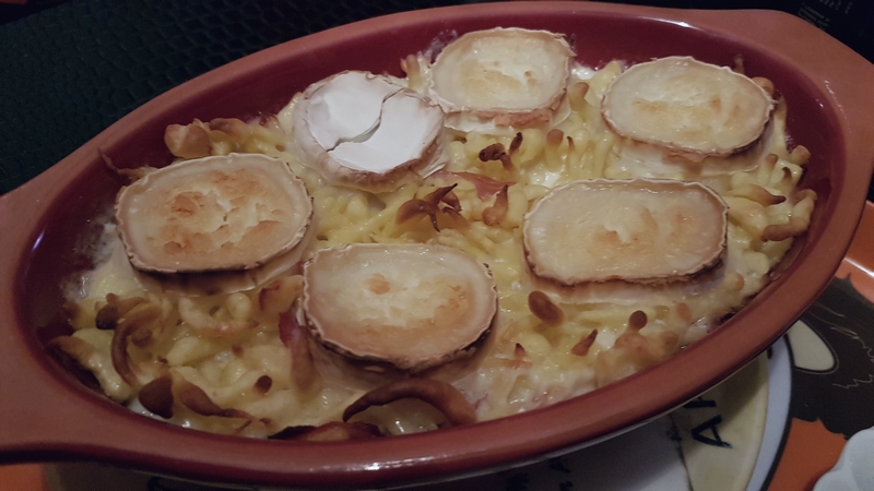 Pour une version en gratin : déposez dans un plat en terre cuite, les späztles, de la crème épaisse entière, des lardons et du chèvre. Passez au four une vingtaine de minutes.
