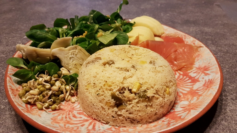 20 gr de flocons d’avoine//20 gr de semoule de blé//1 cuillères à soupe de saumon cuit émietté//1 œuf//20 gr de boursin cuisine//10 olives vertes//3 cuillères à café de maïs//1/2 yaourt blanc à 0%//1/2 sachet de levure chimique//1 filet de jus de citron//sel, poivre et aneth