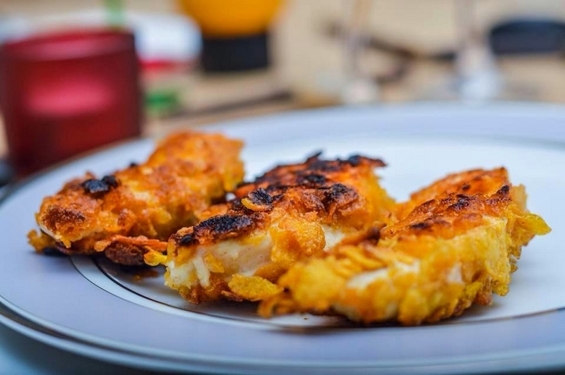 Passez chaque aiguillette dans la farine, puis dans le blanc d’œuf et pour finir dans les corn flakes. Recouvrez bien tout le poulet de corn flakes.