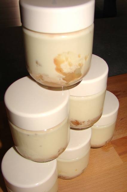 Battez le lait concentré avec le yaourt nature. Ajoutez le lait froid tout en fouettant le mélange. Versez la préparation dans les pots.