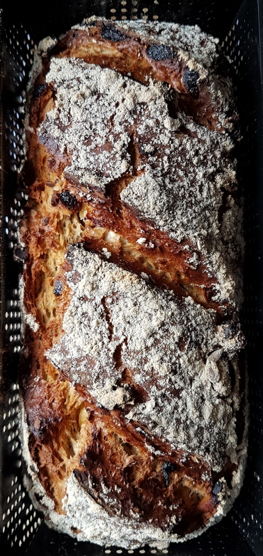 150 gr de levain maison//420 gr de farine multi-céréales//120 gr de lait écrémé//120 gr d’eau//2 cuillères à café de miel//15 gr de beurre//20 gr de raisins de Corinthe// 40 gr de mangues séchées// 100 gr de muesli// 1 pincée de sel