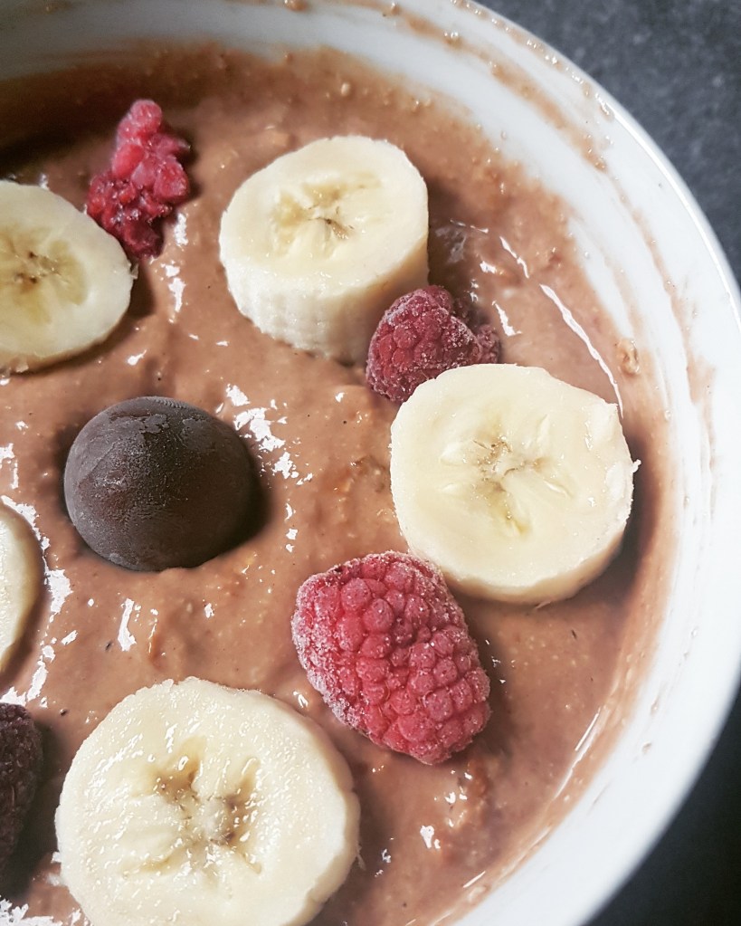 20 gr de flocons d’avoine//20 gr de farine d’avoine aromatisée au Nutella//1 œuf//1 banane//1/2 pot de yaourt blanc//1 cuillère à café de levure chimique//10 gr de préparation pour pudding au chocolat//quelques framboises congelées//1 oeuf en chocolat noir