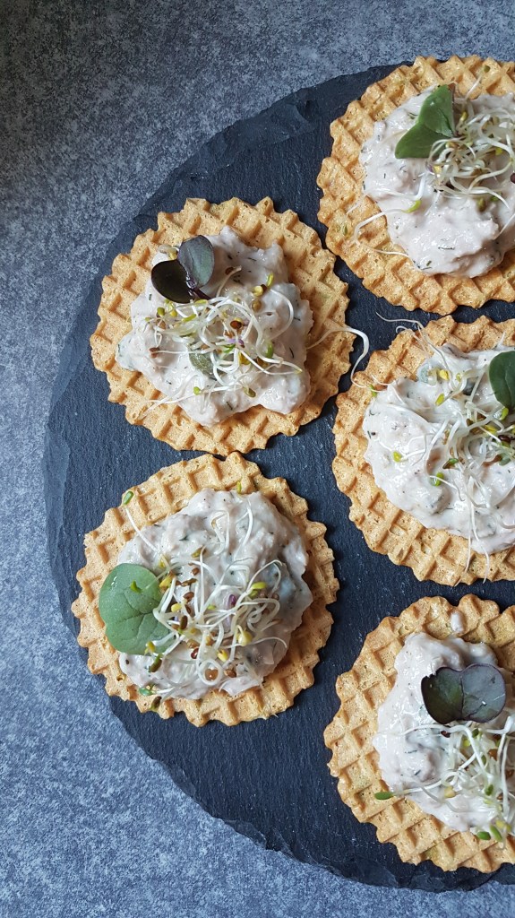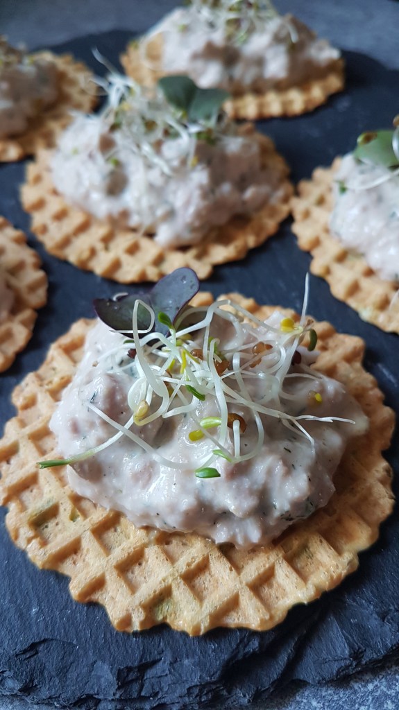 1 paquet de gaufrettes fines herbes ww//1/2 yaourt blanc nature 0%//1/2 boîte de thon au naturel//quelques câpres//sel fumé « vicking » de chez Terres exotiques//quelques gouttes de jus de citron//aneth//graines germées et pousses de brocoli