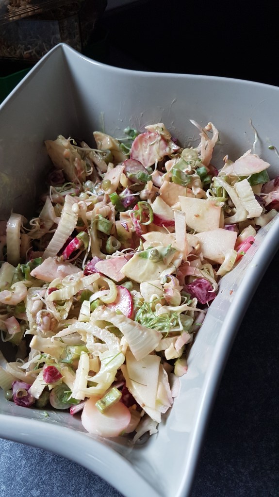 1 bulbe de fenouil avec les tiges//1 pomme golden//4 radis ronds//2 cuillères à soupe de betteraves coupées en dés//1 cœur de palmier//1 oignon nouveau//mélange de graines germées//1/2 yaourt blanc à 0%//une partie des fanes de fenouil//1 cuillère à café de moutarde à la mangue//1 filet de jus de citron// sel et poivre