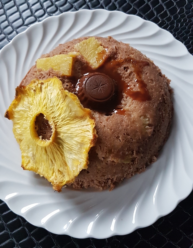 20 gr de flocons d’avoine//20 gr de farine d’avoine aromatisée au Nutella//1 œuf//1 banane//2 cuillères à café de skyr//1 cuillère à café de levure chimique//10 gr de préparation pour pudding au chocolat//quelques morceaux d’ananas frais//1 chocolat au beurre de cacahuètes//1 cuillère à café de sauce au chocolat régilait//1 tranche d’ananas déshydratée