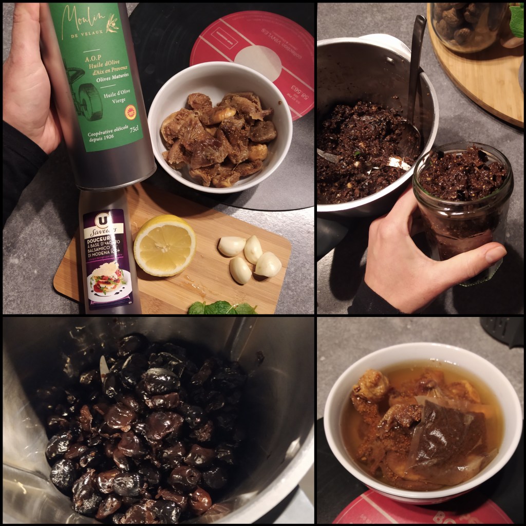 400 gr d’olives noires sans noyaux//120 gr de figues sèches réhydratées dans de l’Earl Grey//