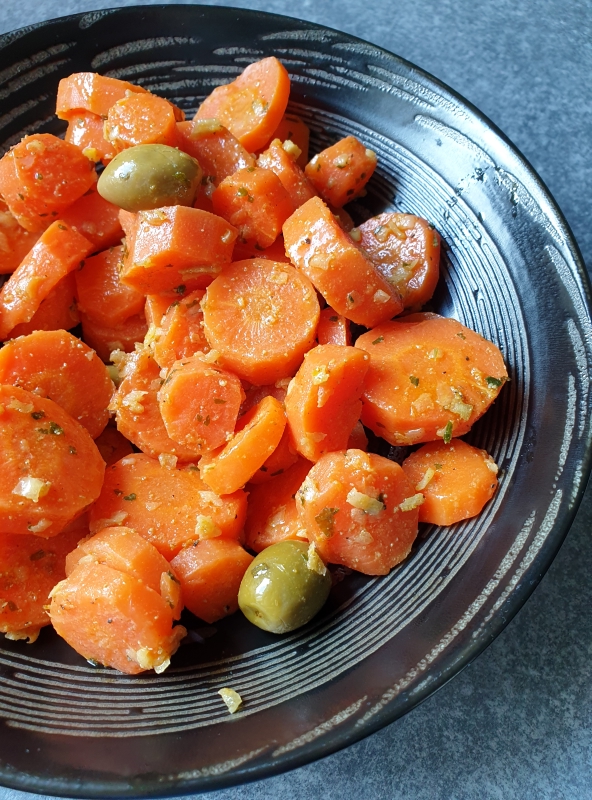 6 grosses carottes//1 cuillère à soupe de vinaigre de Côteaux de Layon (ou un autre vinaigre de vin)//2 cuillères à soupe d’huile d’olive//1 cuillère à café de moutarde//une dizaine d’olives vertes//sel et poivre//2 cuillères à soupe de flocons d’ail déshydraté//2 cuillères à café minimum de cumin moulu//1 cuillère à soupe de persillade