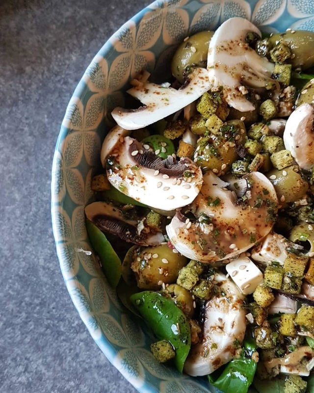 Prenez un saladier en fonction du nombre de convives et posez 50% de salade (ici de la mâche). Posez 30% de légumes coupés ; pour cette recette, des champignons frais de Paris, coupés en fines lamelles. Les 20% qui restent sont pour les toppings : dans notre cas ; des croûtons, des graines de sésame, des olives vertes et des dés d’emmental. Pour la vinaigrette, par contre, je fais attention au grammage et la recette arrive juste sous la photo !