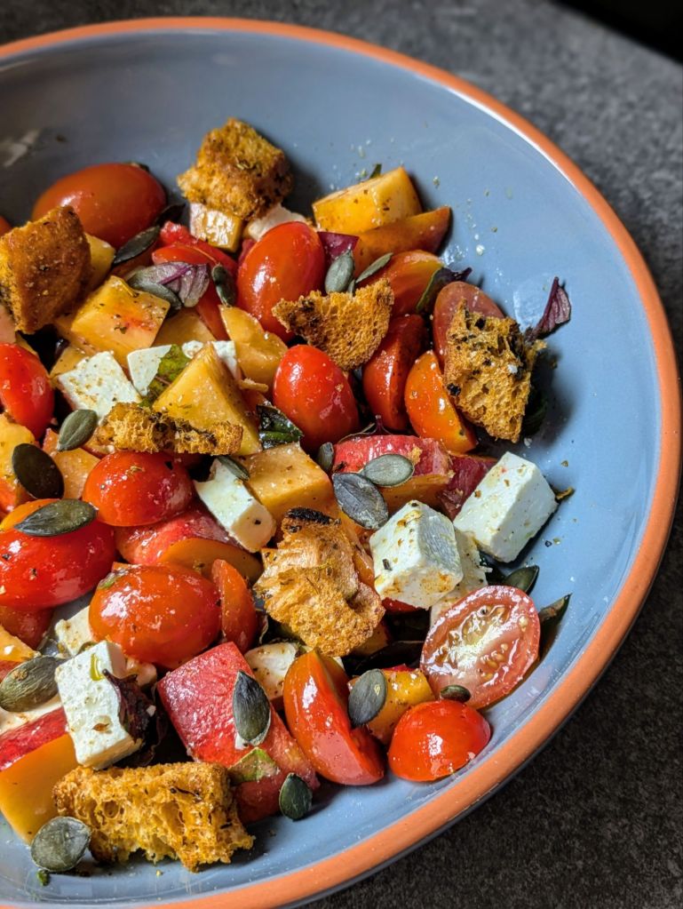 1 pêche//une dizaine de tomates cerises//quelques croûtons maison//une dizaine de morceaux de féta//un filet d’huile d’olive//graines de courge//sel et poivre//basilic ciselé