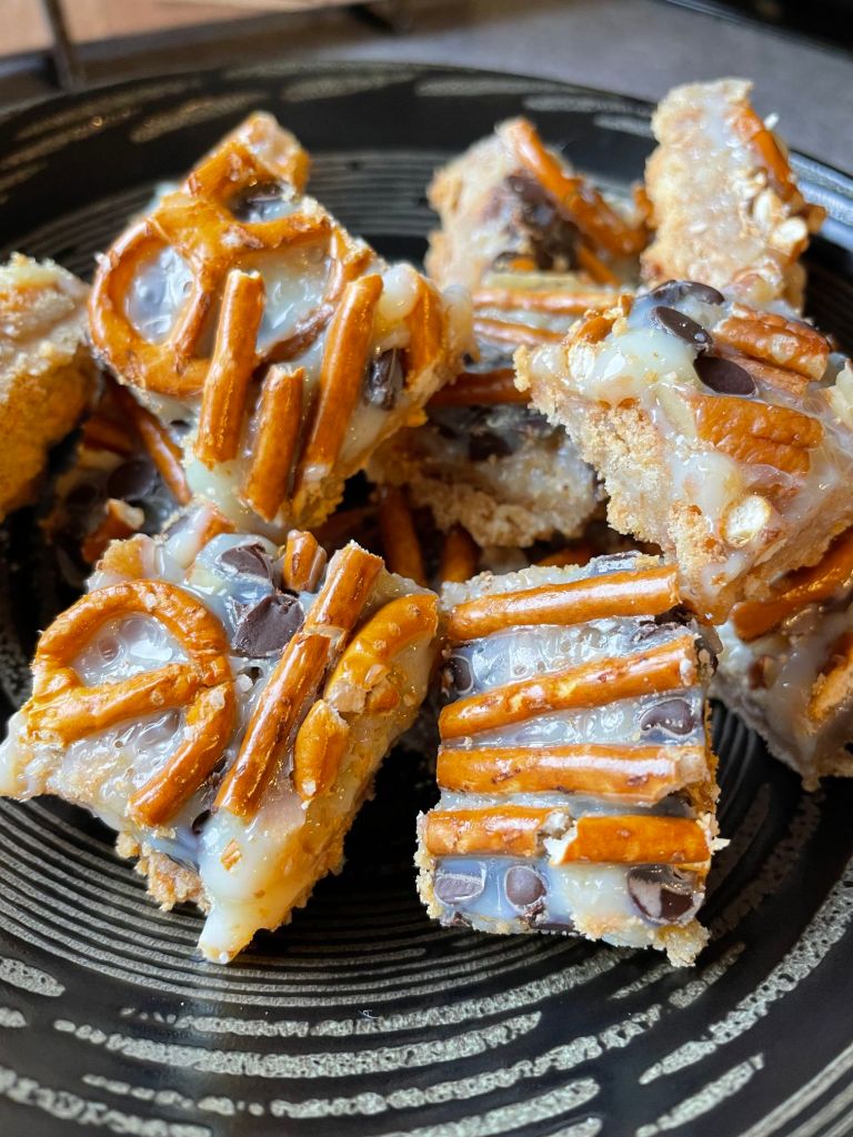 200 gr de biscuits de type « sablés anglais »//350 gr de lait concentré sucré//20 gr de pépites de chocolat noir//quelques noix de pécan//bretzels et sticks à votre convenance//fleur de sel