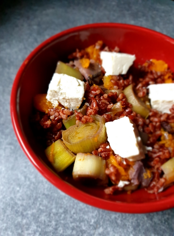 4 blancs de poireaux//1 petite courge butternut//250 gr de riz complet//1 sachet de shiitakés déshydratés//1 cuillère à café d’huile d’olive//15 cl de vin rouge// 1 barquette de féta nature//muscade//sel et poivre