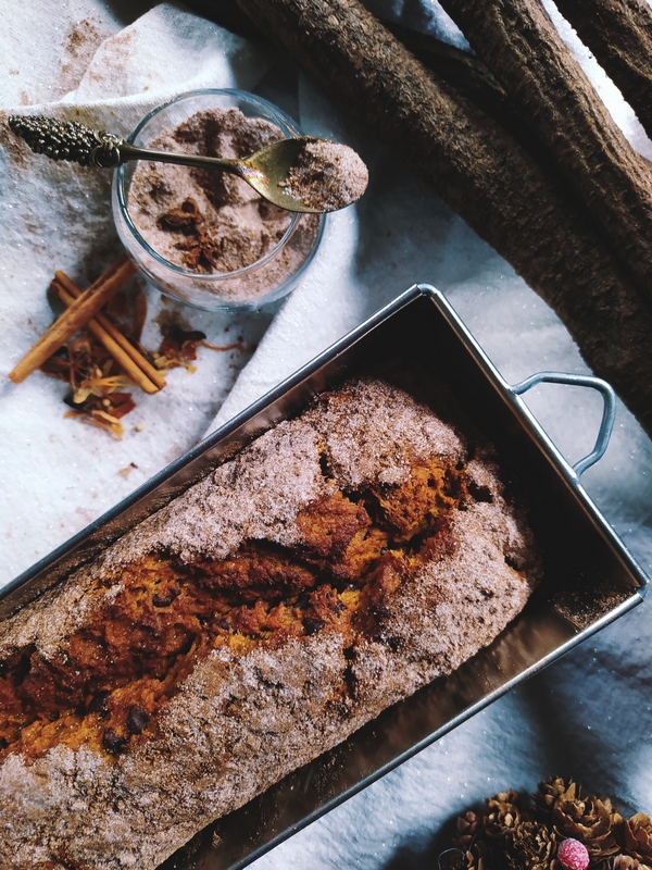 270 gr de farine//150 gr de sucre parfumé à la vanille + 2 cuillères à soupe//340 gr de purée de citrouille//1 cuillère à soupe de liqueur de sirop d’érable//1 cuillère à café de levure chimique//2 œufs//3 cuillères à café d’épices pour pain d’épices + 1/2 cuillère à soupe//100 gr de pépites de chocolat//le jus d’une orange bio//10 cl d’huile d’avocat