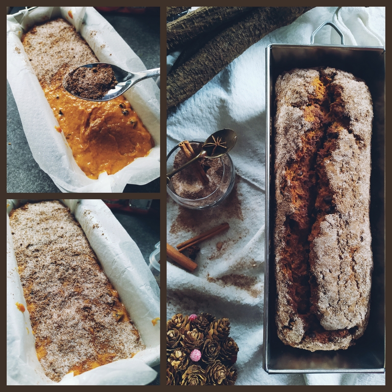 Préchauffez le four à 180°C. Versez la préparation dans un moule à cake chemisé de papier sulfurisé. Saupoudrez généreusement du mélange sucre et épices (les 2 cuillères à soupe de sucre restantes et la demie cuillère à soupe d’épices).