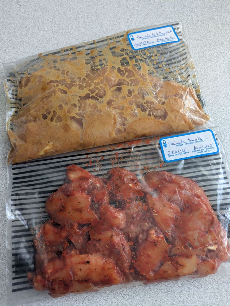 Préparez la seconde marinade en mélangeant le reste de l’huile avec le concentré de tomates et un filet de Maggy. Ajoutez les épices pour pâtes et les herbes de Provence à votre convenance. Salez et poivrez. Déposez le reste du poulet dans le saladier et imprégnez la viande de ce mélange. Placez votre préparation dans un sachet congélation.