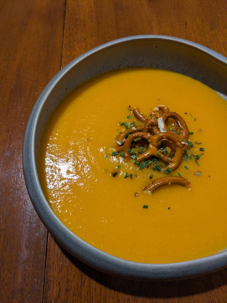 Au bout de 30 minutes, quand le mode velouté est terminé, ajoutez la crème et mixez quelques secondes. Servez bien chaud avec en topping quelques bretzels et un peu de ciboulette ciselée.
